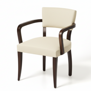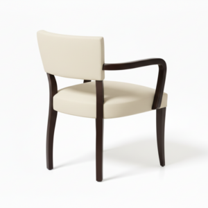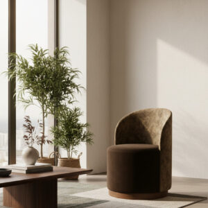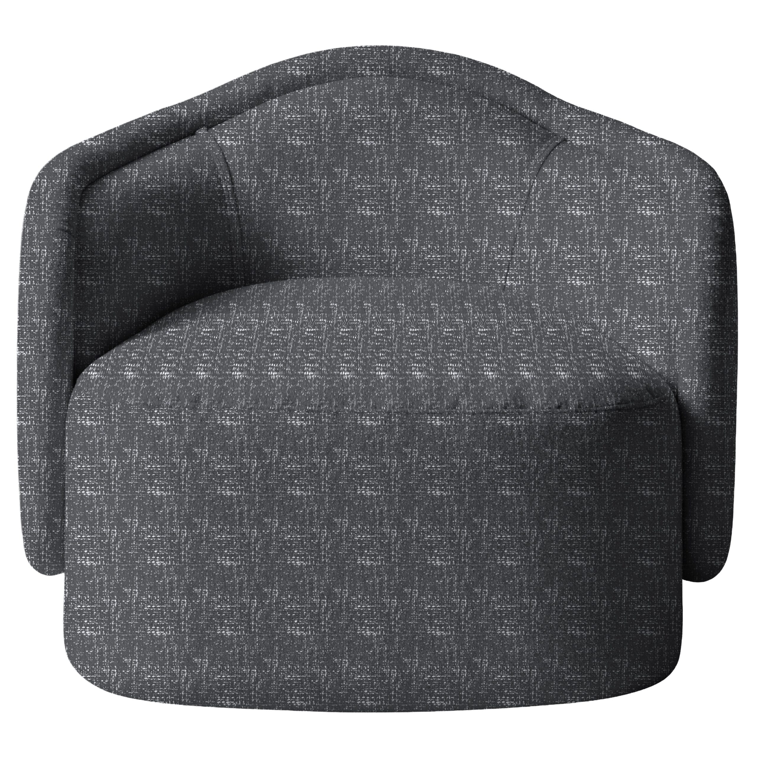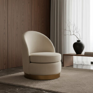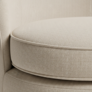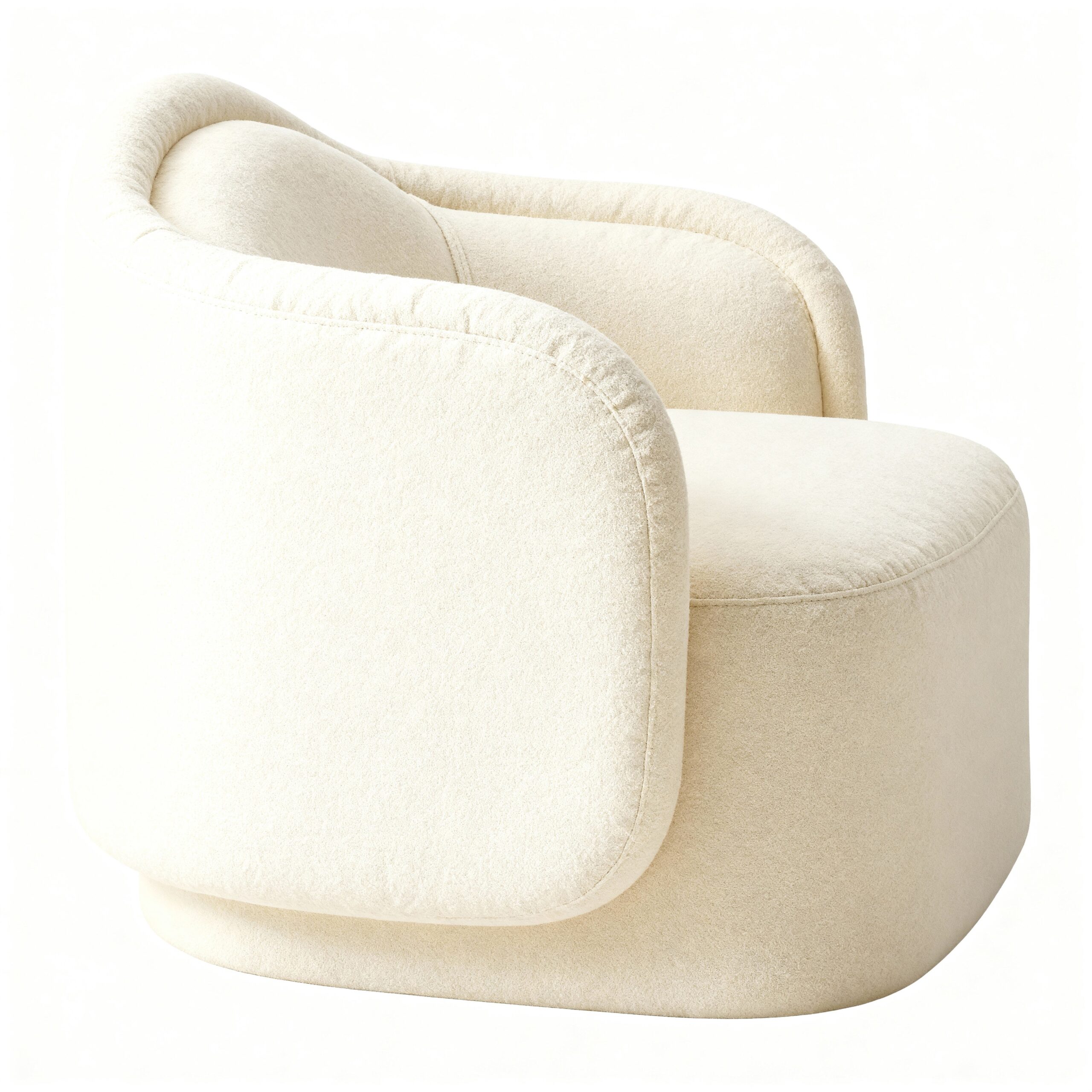 The Dandelion’s curved barrel back wraps around a generous, rounded seat, creating a deep, sink-in perch that still feels tailored. Subtle piping traces the inside back and seat edge, highlighting the silhouette without feeling busy. The chair sits on a low, recessed plinth base that visually “floats” the form while keeping the profile grounded and modern.