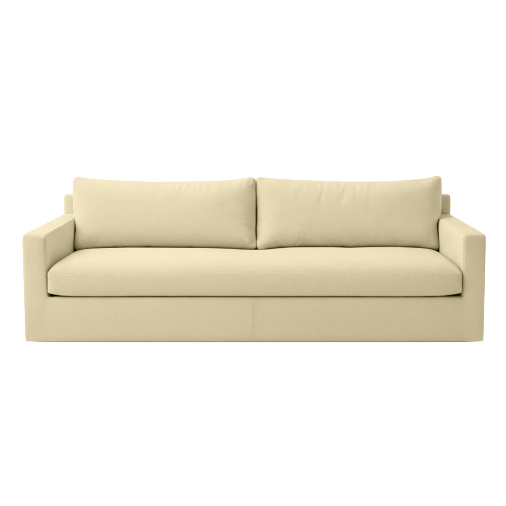 The Envelope Sofa is drawn as a clean, architectural line, with a slim bench seat and tall, sheltering arms that frame the sitter. The profile stays low and modern, but the proportions are generous enough for real lounging.